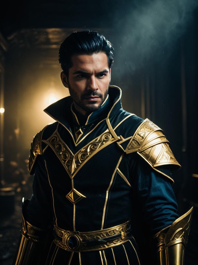 Portrait of a man dressed in a detailed Nerevarine cosplay costume featuring intricate gold and black armor elements. The costume includes golden shoulder guards, gauntlets, and a decorative chest piece, with a dark undergarment. The setting has moody, dramatic lighting with a smoky background, highlighting the realistic and intricate design of the cosplay.