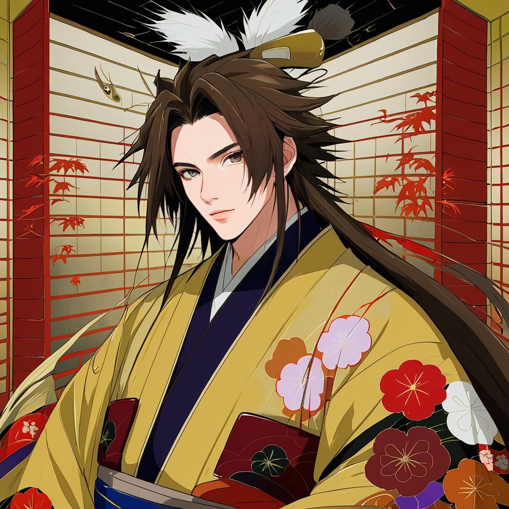 Digital anime-style drawing of a handsome young man with long, spiky black hair and white feathers in his hair. He wears a yellow kimono adorned with red, white, and purple flowers, and a dark blue undergarment. His expression is serious, with sharp, piercing eyes. The background features a traditional Japanese shoji screen with red bamboo patterns. The image uses bold colors and clean lines, emphasizing the character's elegant yet intense appearance. The style is reminiscent of Japanese anime and manga art.