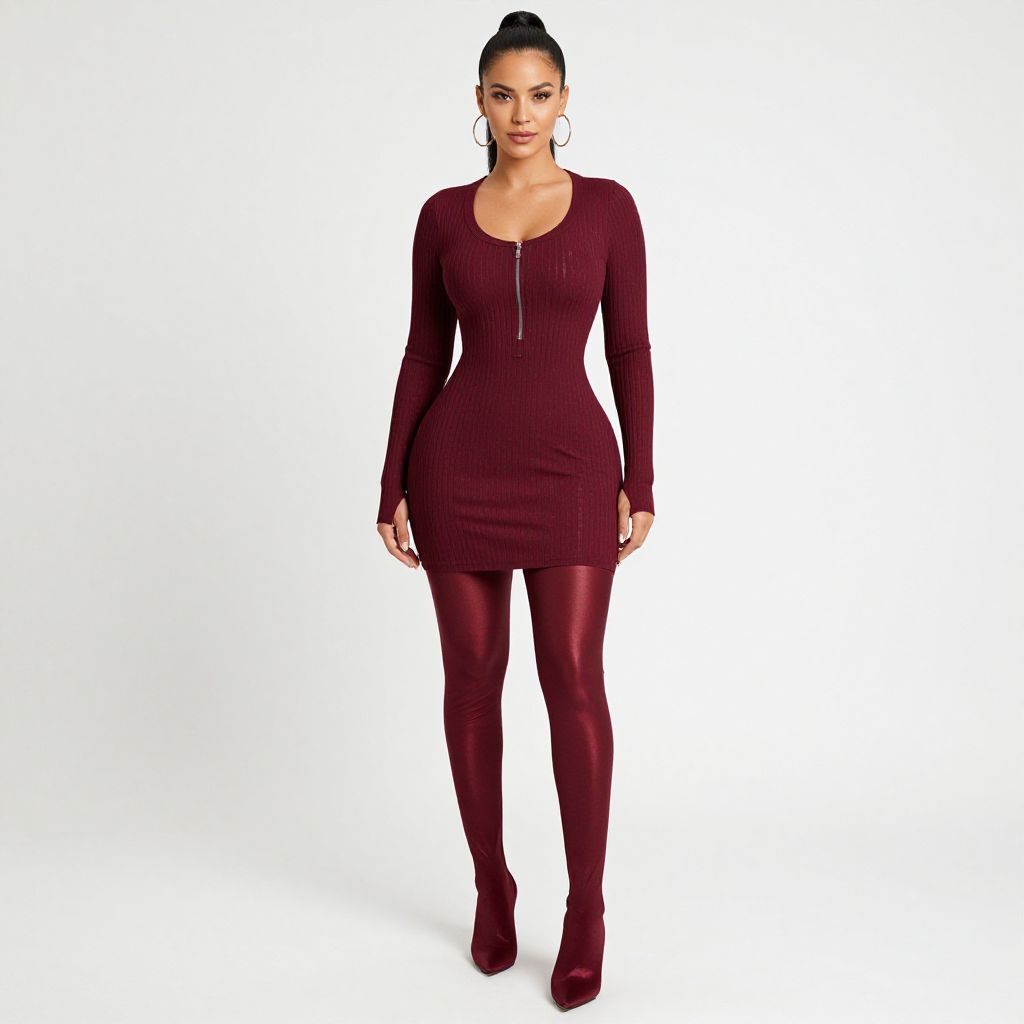Full body shot of a woman with a realistic face wearing a burgundy ribbed bodycon dress featuring a round neckline and central zipper extending to the chest. She has long sleeves, a fitted silhouette, and mini-length dress paired with matching shiny leggings and pointed high-heeled boots. The woman wears large hoop earrings and has sleek black hair styled in a high ponytail, standing against a white studio background.
