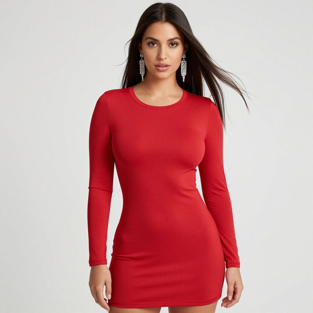 Photograph of a confident woman with dark hair in a bun, wearing a maroon long-sleeve dress, matching tights, and heels,
