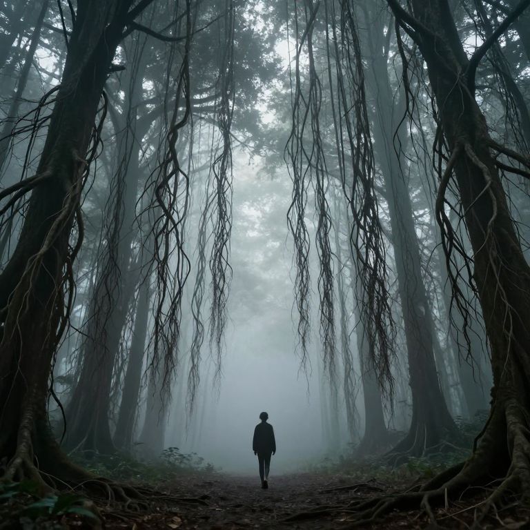 Silhouetted figure walking down misty, eerie forest path with tall, hanging tree branches framing a foggy, ethereal background. Photographic