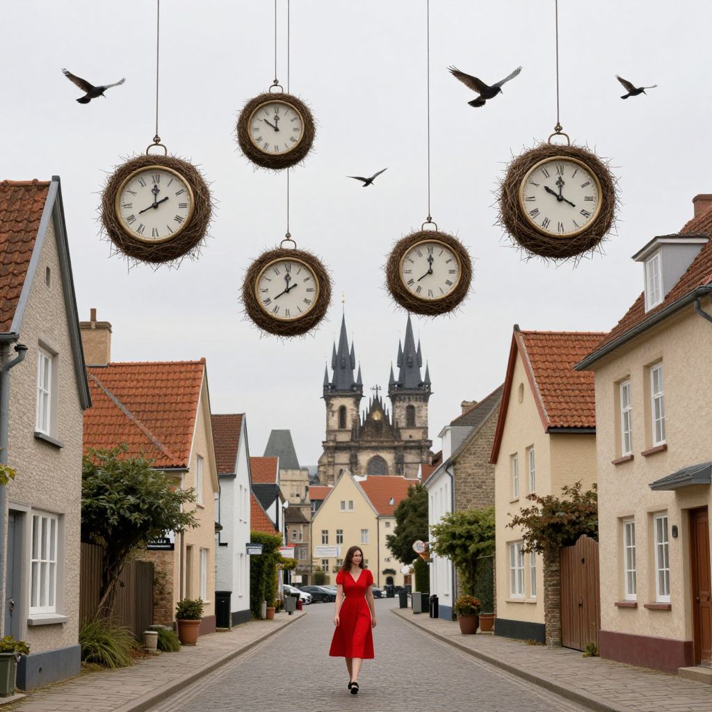 Surreal street scene unfolds with four floating clocks encased in bird's nests suspended above a cobblestone path, flanked by quaint houses, as birds soar amidst a backdrop of historic spires and a woman in a red dress walks below.