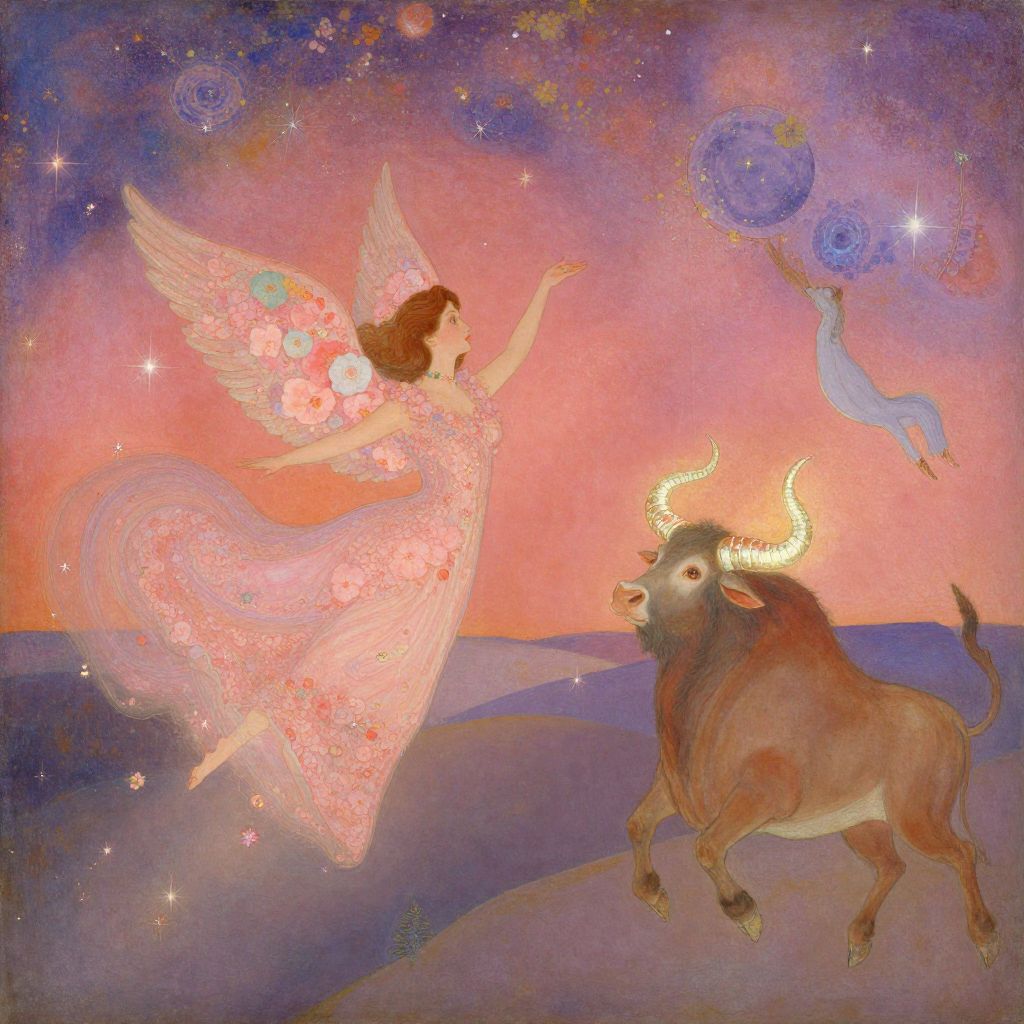 Digital painting of a pink-winged angel in a glowing dress, reaching for floating blue orbs, above a brown bull with golden horns under a vibrant,