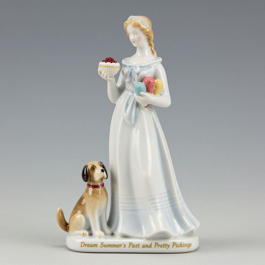 A delicate porcelain figurine by Lladro, titled \"Dream Summer's Past and Pretty Pickings,\" depicts a woman in a flowing white gown holding colorful confections, accompanied by a seated dog, all crafted with meticulous detail and a vintage charm.