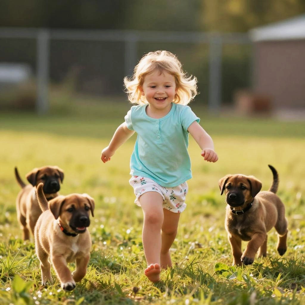 Photograph of a cute blonde-haired, smiling little girl with light skin, wearing a light blue shirt and white floral shorts, running barefoot in a grassy field. She's surrounded by playful, brown, adorable puppies. The background shows a blurred, fenced area, indicating an outdoor setting. The sunlight casts a warm glow on the scene, highlighting the joyful moment.