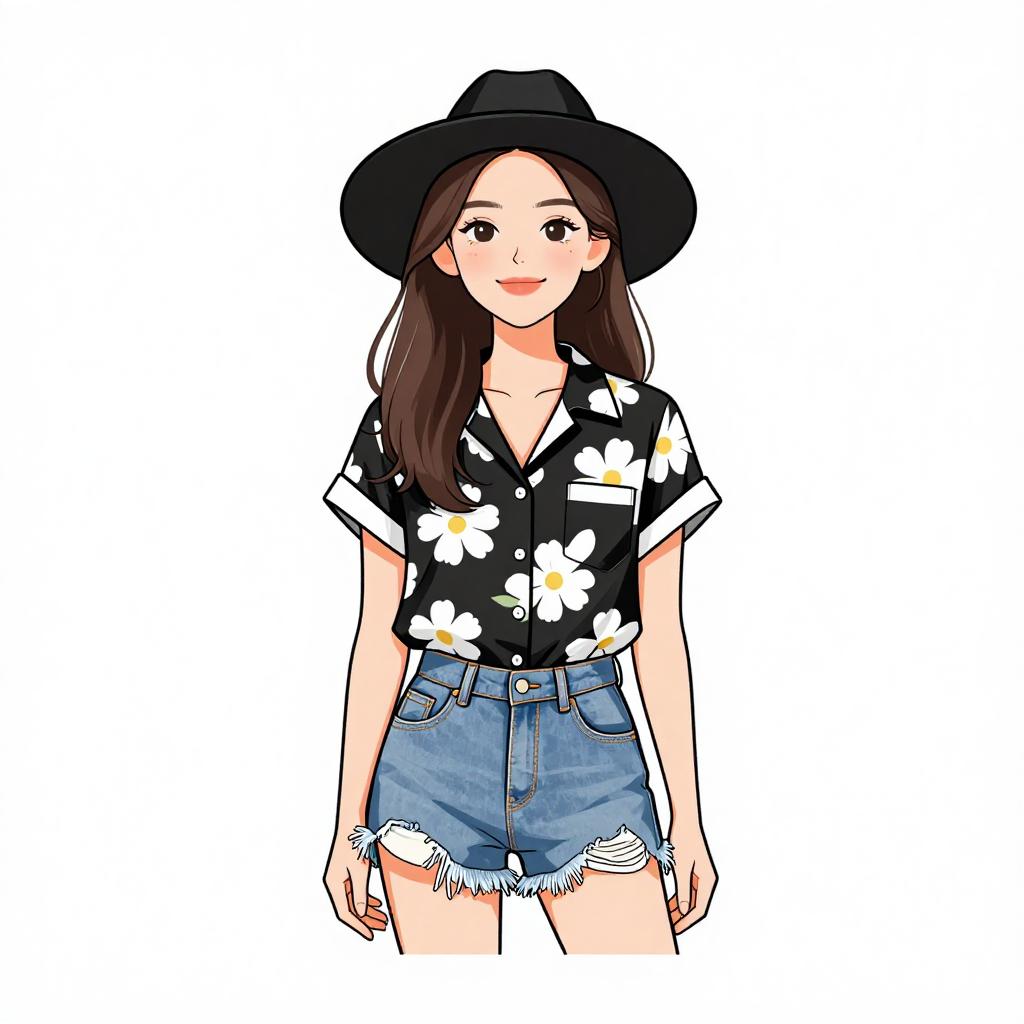 This is a digital drawing of an East Asian woman with long brown hair, wearing a black wide-brimmed hat, a black floral shirt with white daisy patterns, and high-waisted blue denim shorts with frayed edges. She has a fair skin tone, rosy cheeks, and a gentle smile. The background is plain white, making the subject stand out. The shirt's sleeves are slightly rolled up, and the shorts have visible pockets. The overall style is colorful and modern, with clean lines and a slightly cartoonish appearance.