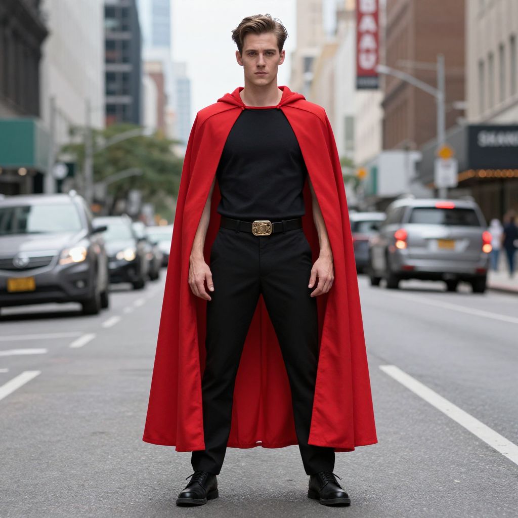Sin City Costume, dressed in a red cape and black pants standing on a city street