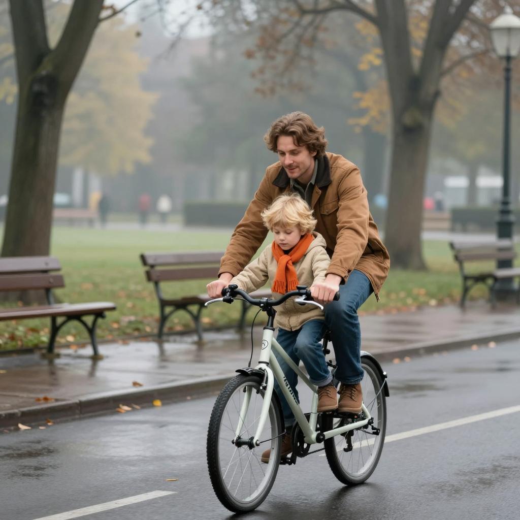 Old white man in gray suit and vest stands beside black boy in green school blazer with yellow striped tie. Both hold bicycle handlebars. Man smiles, boy looks at man. Background blurred with people. Bright daylight.