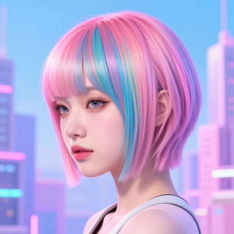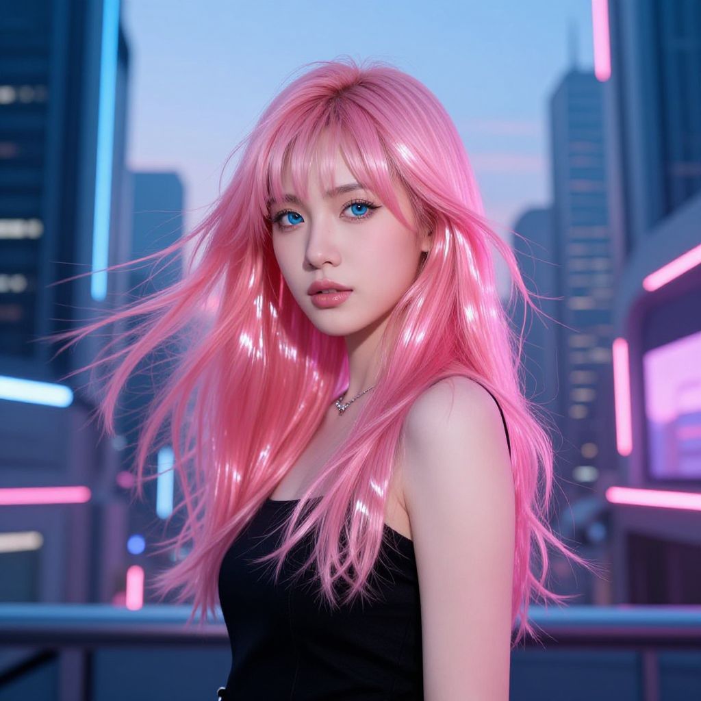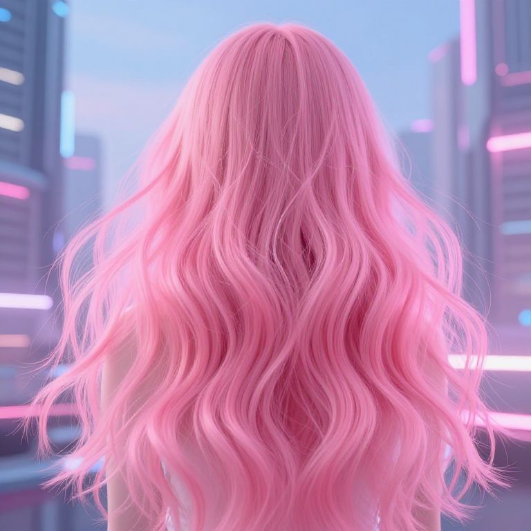 Wavy pink hair cascading down a futuristic city backdrop, soft neon lights reflecting off strands, vibrant and ethereal, digital art with a dreamy atmosphere