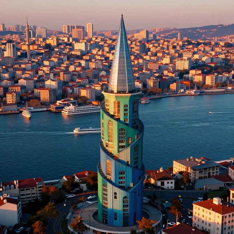 The image presents a surreal, futuristic cityscape of Istanbul, captured from an aerial perspective. At the center of the Bosporus, a parametric wooden tower stands tall, its intricate design resembling a spiral staircase. The tower's vibrant blue and green hues contrast beautifully with the deep blue waters surrounding it. The structure is adorned with numerous windows, reflecting the warm, cinematic lighting that bathes the scene. Floating objects, including boats and ships, dot the water, adding to the dreamlike quality of the image. The city in the background, with its dense array of buildings, is bathed in a soft, warm glow, creating a striking juxtaposition with the cooler tones of the tower. The overall composition is balanced, with the tower serving as the focal point, drawing the viewer's eye through the scene and into the heart of the city.