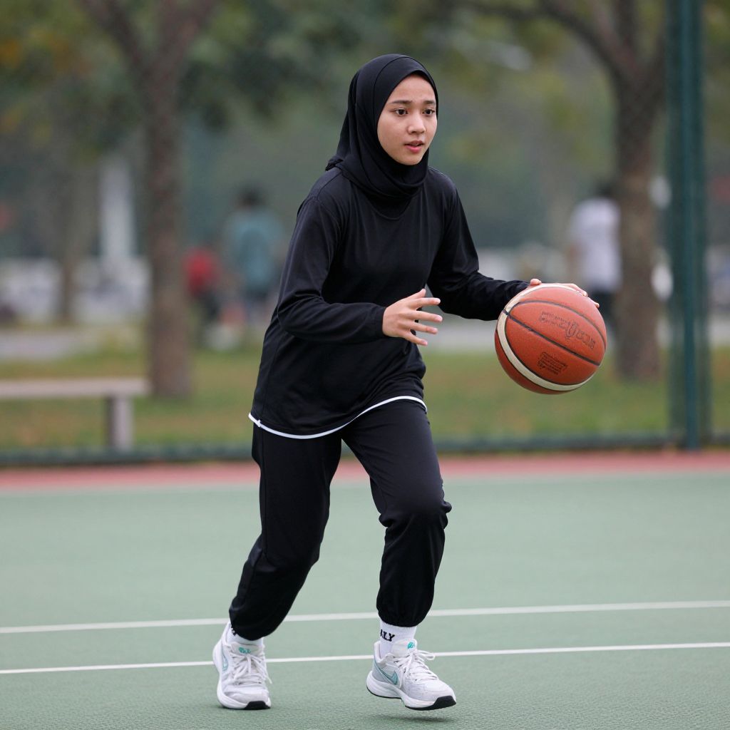Young Muslim woman wearing a black hijab and sportswear dribbling a basketball on an outdoor court, her body poised in motion with one hand extended for balance.