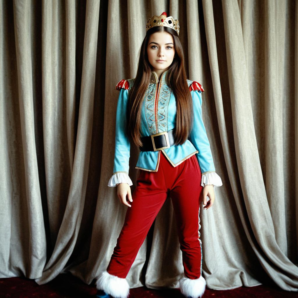 Arabian nutcracker costume,1girl, solo, red pants, brown hair, long hair, looking at viewer, pants, standing, long sleeves, curtains