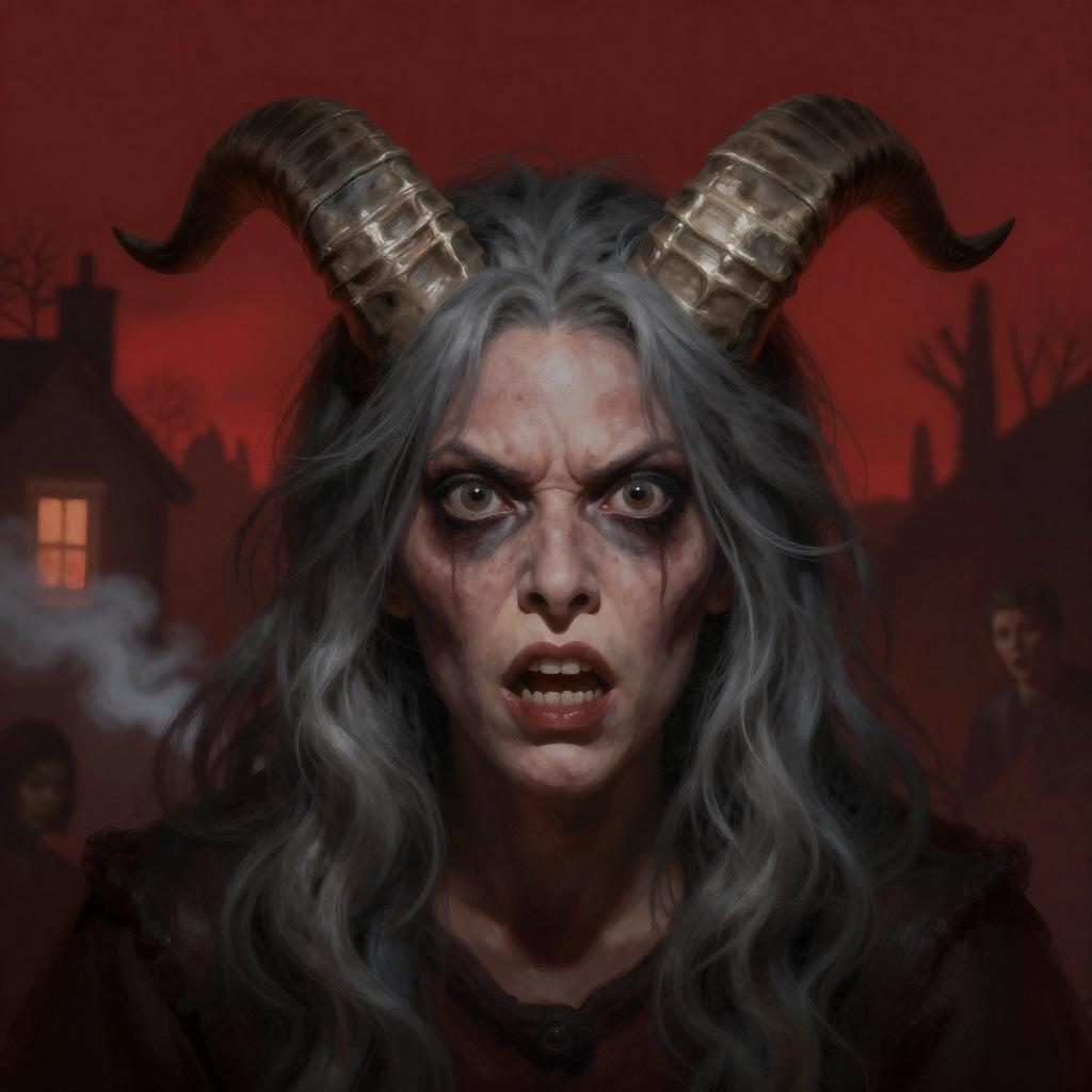 Digital painting of a horror figure with large, wild gray hair, exaggerated eyes, and a menacing face. A large, curved, metallic horn extends from the right side of its head. Background: red sky, dark trees, house with glowing window, smoke rising. Figure's expression is intense and startled.