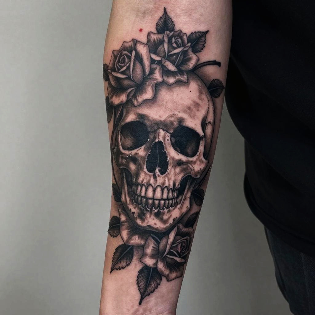 Photograph of a detailed black and gray tattoo on a forearm, featuring a realistic skull adorned with roses and leaves.