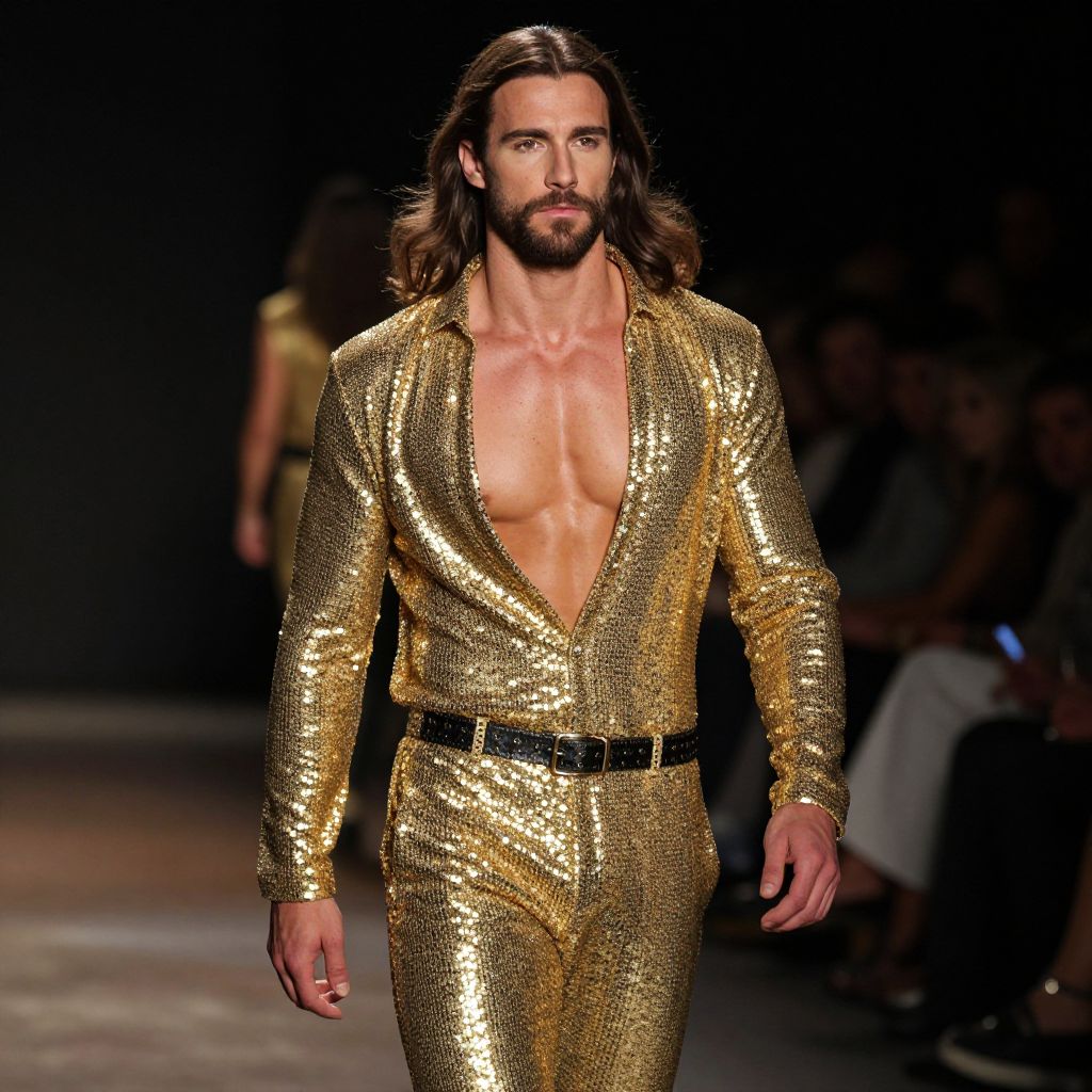 Photograph of a muscular male model with long brown hair and a beard, walking down a dimly lit runway. He's wearing a shiny, gold sequin jumpsuit with a deep V-neck and a black belt. His expression is serious, and his physique is well-defined. The background is dark, with blurry audience members seated on either side.