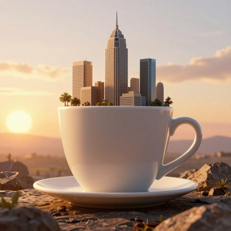 In a surreal 3D-rendered scene, a colossal coffee cup emerges from a rocky landscape, dwarfing miniature skyscrapers that thrive atop its brim, bathed in the golden-hour glow of a fantastical sunset.