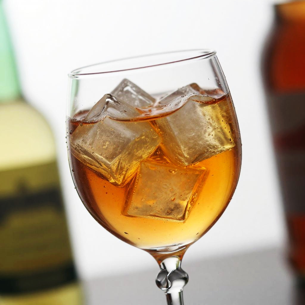 This is a close-up photograph of a glass of amber-colored liquid with ice cubes, taken at an angle. The glass has a twisted, spiral-shaped stem. The background is blurred with soft hues of white, green, and red, giving a bokeh effect. The lighting is bright, highlighting the ice cubes and the liquid's golden tones. The image has a slightly exaggerated, almost artistic style with sharp focus on the glass and ice.