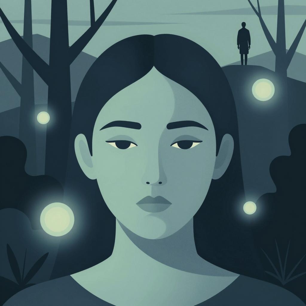 A stylized and surreal portrait of a woman with long hair in cool blue and green tones. She is surrounded by abstract trees and glowing orbs, creating a mystical evening atmosphere. In the background, a silhouette of a figure stands among softly layered mountains, all rendered with minimal shading and flat color blocks.