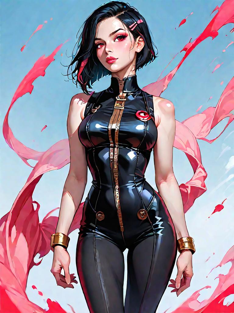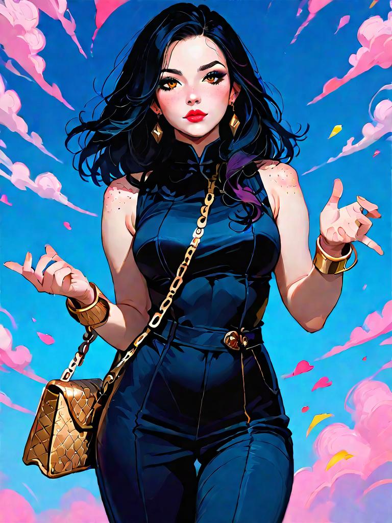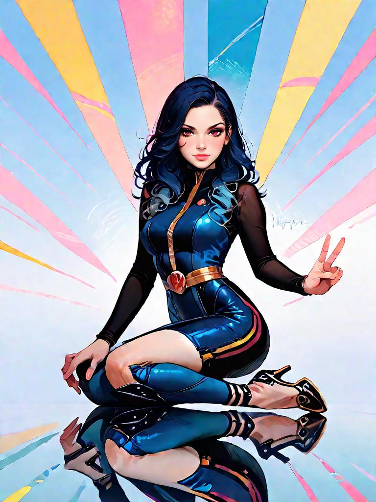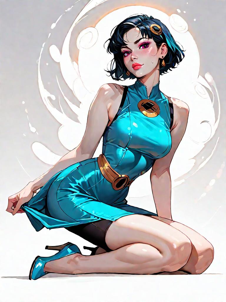 1girl, source_comics, realistic face, full body shot, Woman, elegance, bodycon dress in royal blue, V-neckline, long sleeves, knee-length, black strappy heels.