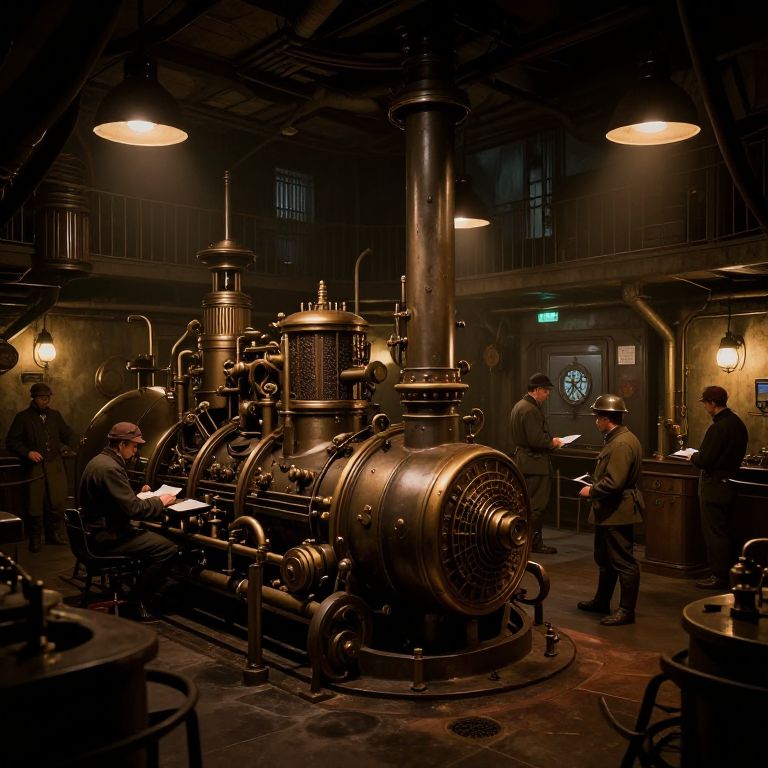 This photograph depicts a dimly lit industrial museum exhibit featuring a large, intricate steam engine as the centerpiece. The steam engine, with its metallic, brass-colored components and numerous pipes, is illuminated by four overhead circular lights, casting a warm glow. Four men, dressed in dark, vintage work clothes and caps, stand around the engine, examining blueprints and taking notes. The background includes a second-story balcony with barred windows and a door with a circular window. The floor is concrete, and the walls are painted dark, adding to the industrial atmosphere. The overall scene has a nostalgic, historical feel, reminiscent of early 20th-century industrial settings.