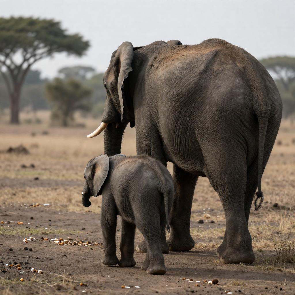 Photograph of a savanna scene with a large, dark gray elephant and a smaller, dark gray elephant calf walking away from the camera. The ground is covered in scattered bird droppings. In the background, blurred trees and a bright sky are visible. The calf is slightly ahead of the adult elephant.