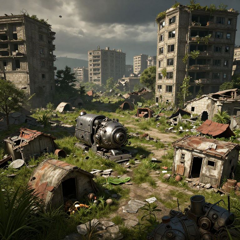 Civilizations in a post-apocalyptic world rebuilding amidst ruins, a mix of scavenged tech and primitive shelters, overgrown urban landscapes with wild flora reclaiming stone structures, atmospheric lighting, gritty textures, realistic detail