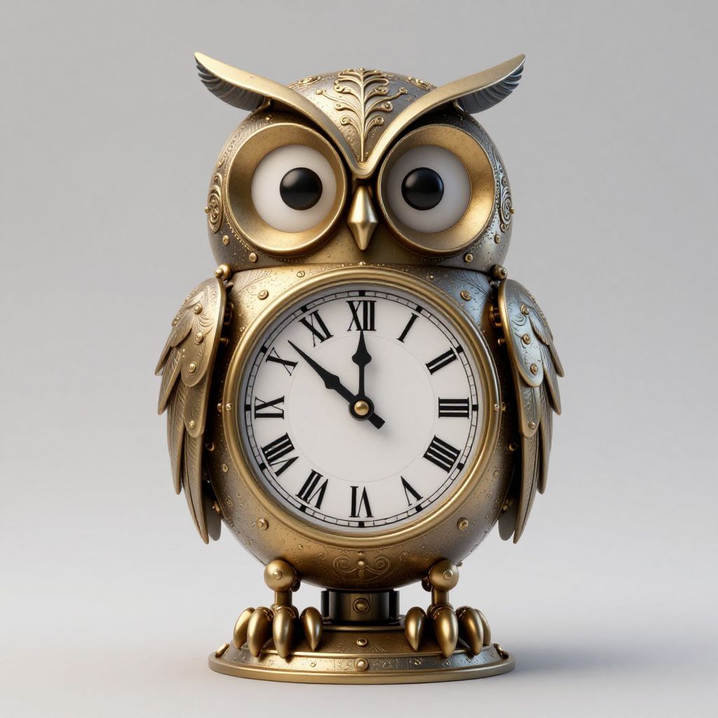 A whimsical 3D-rendered mechanical owl clock tower, crafted with intricate feather details and claw-like appendages, humorously displays Roman numerals on its face, blending vintage charm with playful, comedic design elements.