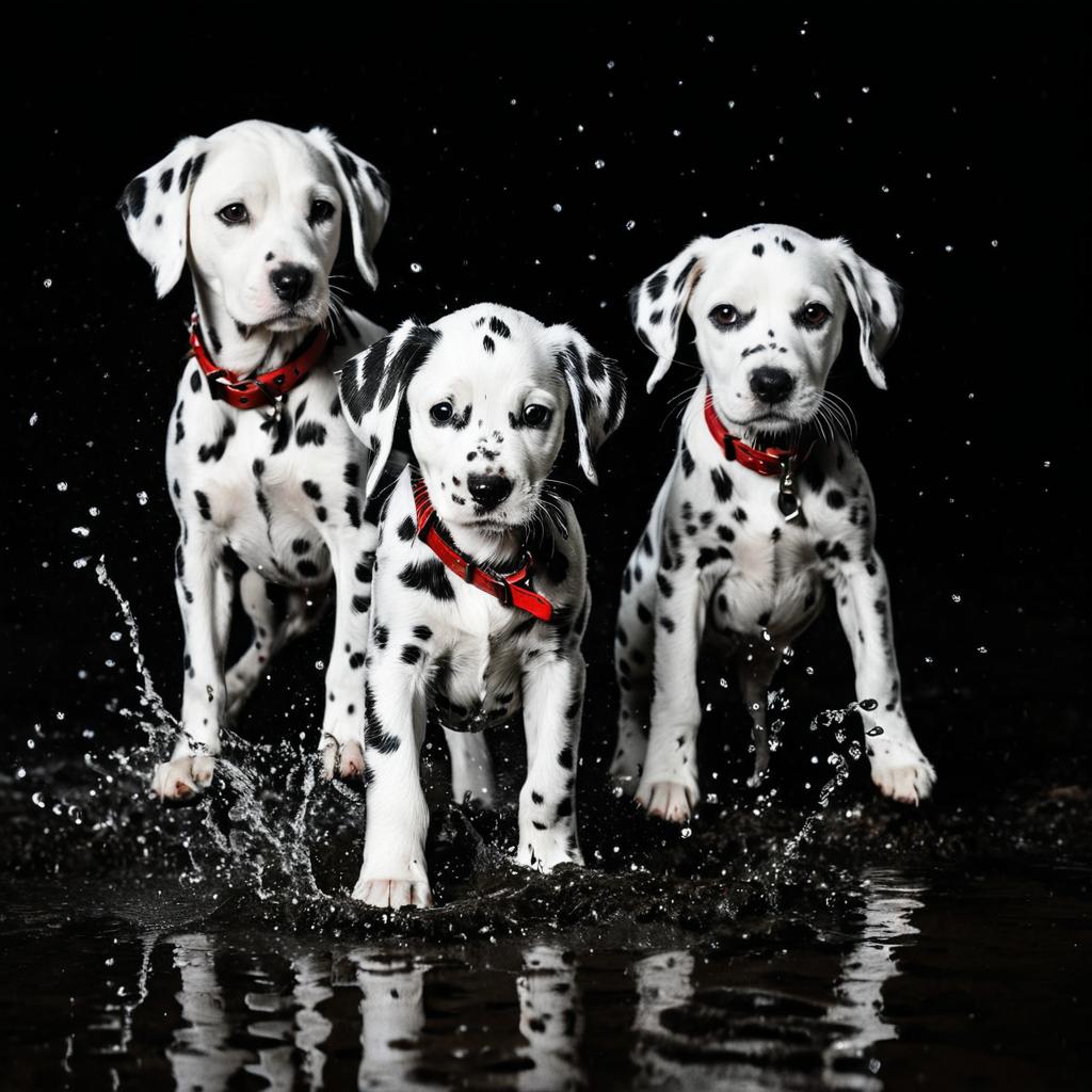 A realistic photo of two playful Golden Retriever puppies (cream, dark golden), rolling in the grass, tiny bandanas, fluffy ears, black background, high-quality and playful scene.
