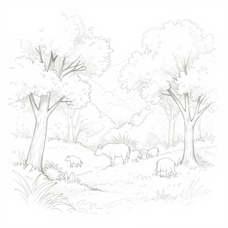 Convert image to drawing outline, nature scene with trees and animals, delicate thin lines and light shading, emphasizing contours and textures, soft and airy pencil sketch style with a minimalist artistic touch