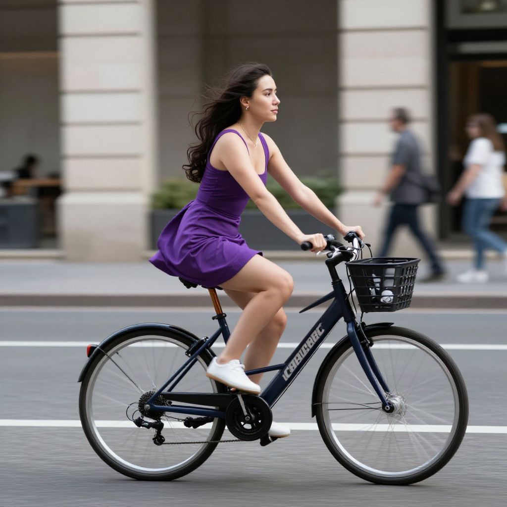 Photograph of a young woman with long dark hair, wearing a purple dress and white socks, riding a black Carrera bicycle on a city street,