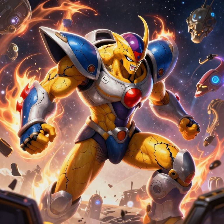 A dynamic digital illustration of a muscular, yellow-skinned superhero with a red helmet and blue armor, standing in a fiery, starry background. His armor features large shoulder pads, a red chest emblem, and blue and white colors with cracks. He has intense, determined eyes and clenched fists. Surrounding him are floating, robotic, robotic heads with glowing eyes. The ground is scattered with debris, and flames engulf the scene, adding a sense of action and energy. The style is vibrant and highly detailed, reminiscent of comic book art.
