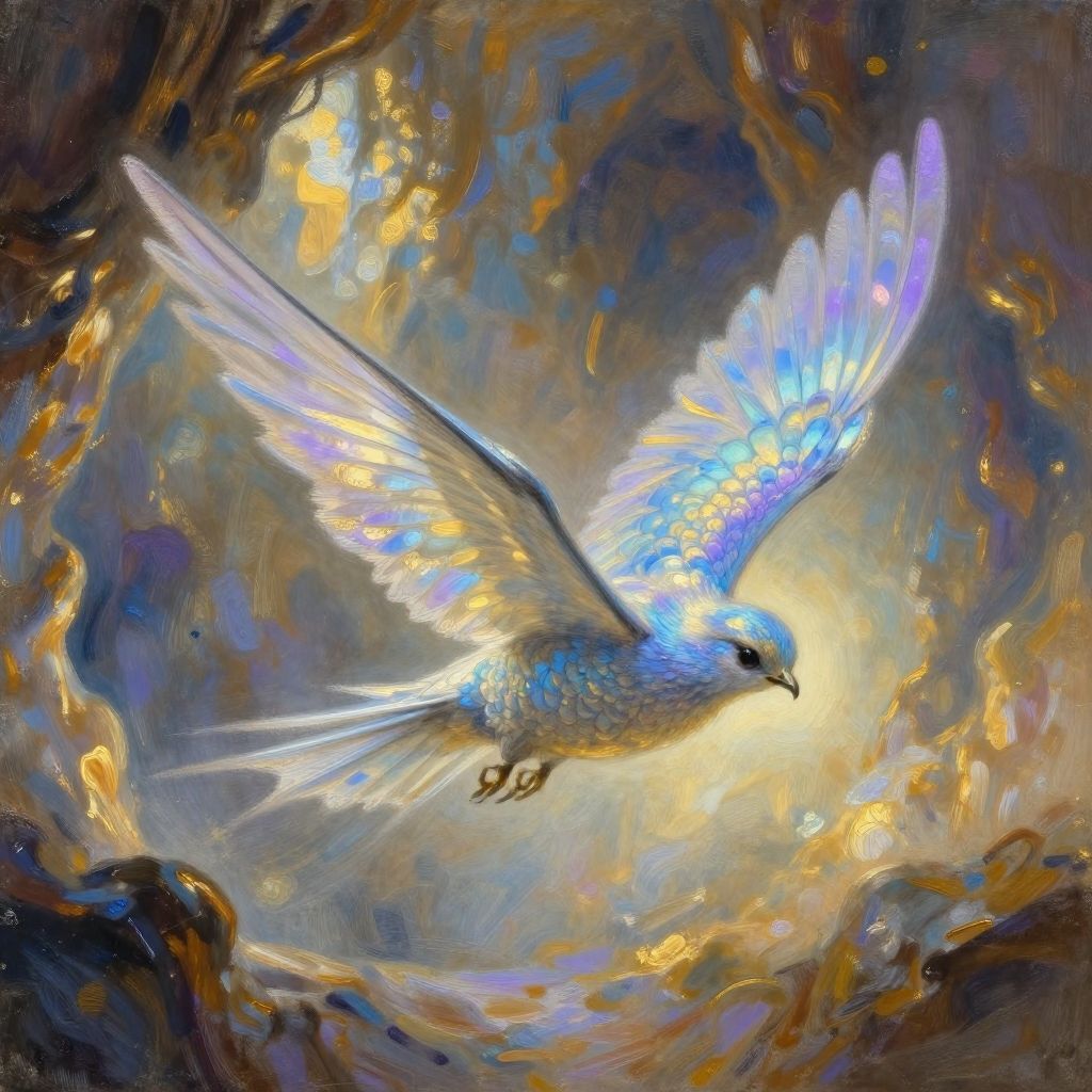 The "Glimmerwings" is a mythical creature that inhabits shimmering caves. Soft blue, warm gold, and iridescent purple lighting illuminates its ethereal form. The camera angle is a wide shot from above. Drawing style: Realistic, Impressionist, Cartoonish. Mixed drawing styles: Shaded sketch of Glimmerwings' delicate wingspan in realistic style, with Impressionist brushstrokes for the surrounding cave and warm, golden lighting. In 4K, ultra HD detail, the texture of its iridescent scales glistens. Prompt: Capture Glimmerwings' mesmerizing flight.