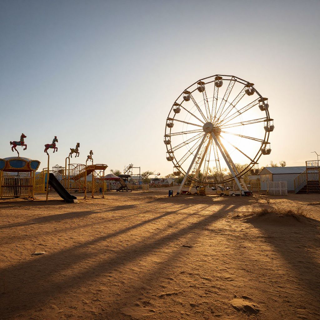 Photograph of a sunlit, sandy carnival with a large, silhouetted Ferris wheel, horse statues, and slides in the background.