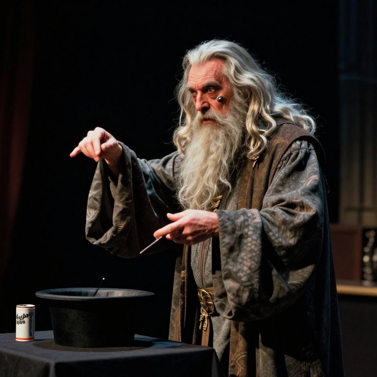 Unnerving Gandalf dressed as a magician of the modern world, performing a magic show, shot on Agfa Vista 200, side-angle view, 4k,