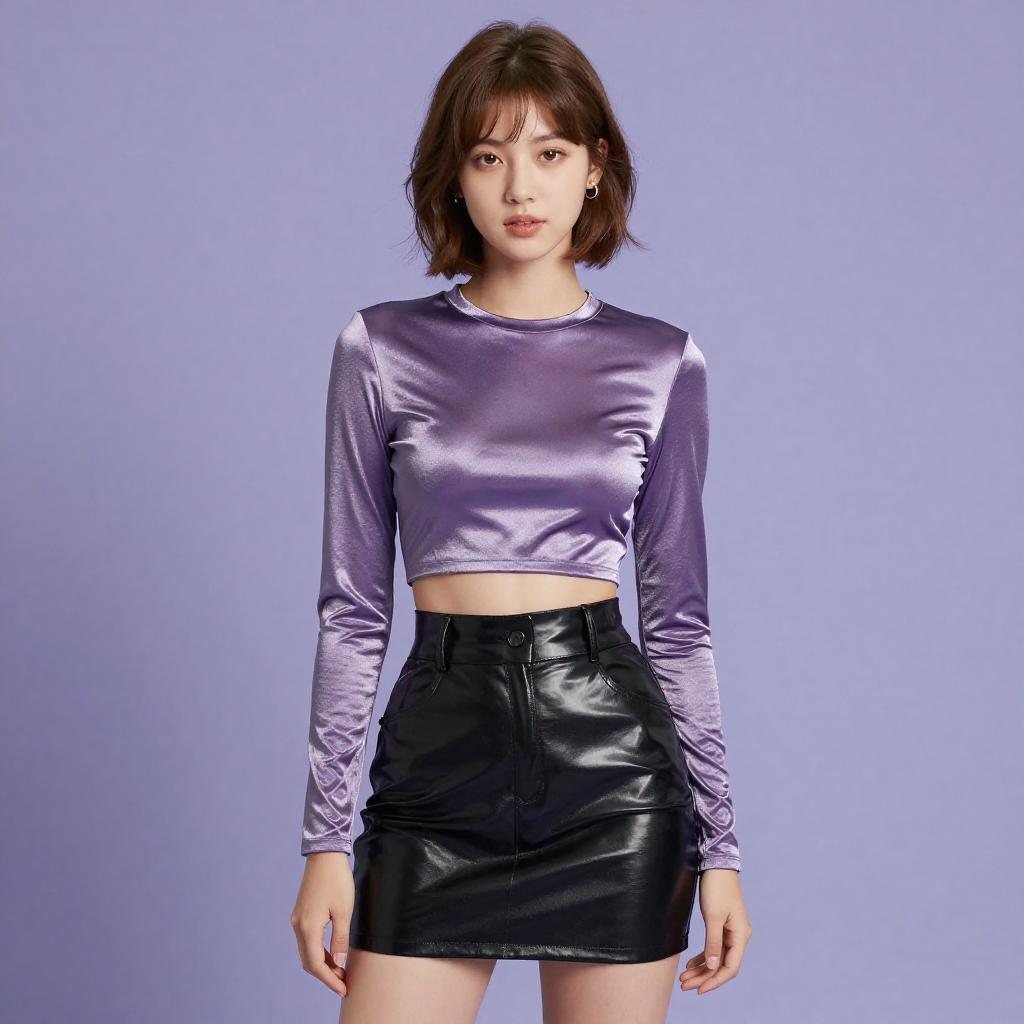 Portrait of a young woman with short brown hair wearing a shiny purple long-sleeve crop top and a black high-waisted shiny mini skirt, posing against a light purple background.