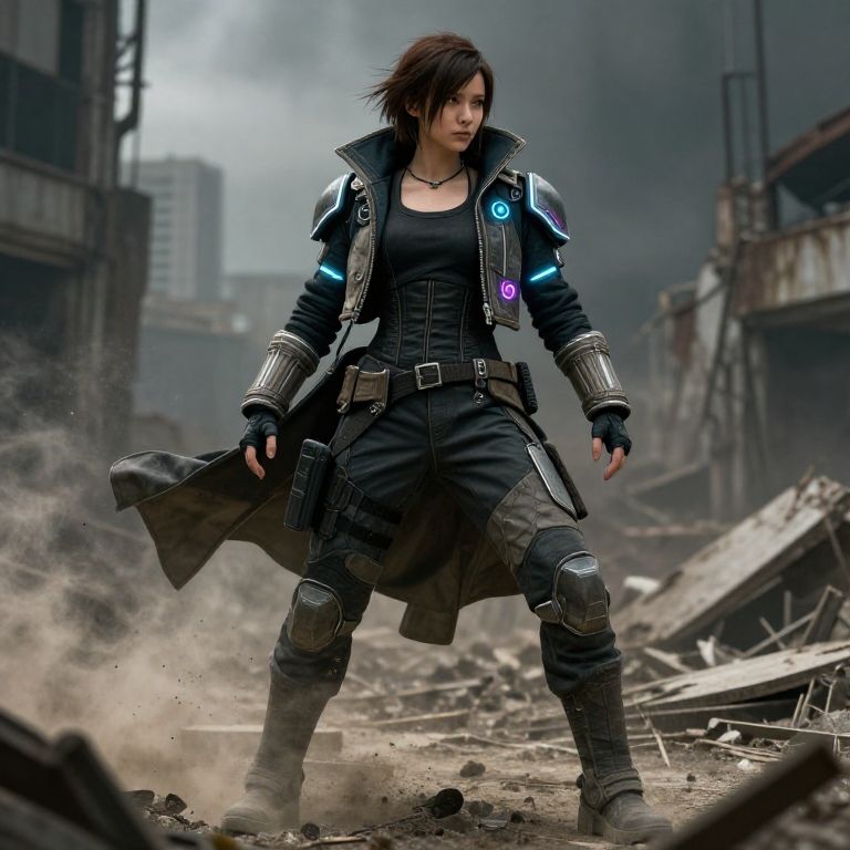 Amy apocalypse outfit, cyberpunk inspired survival attire with glowing neon accents, heavy armored jacket and reinforced pants, desolate urban ruins in the background, gritty and detailed fabric, dynamic action pose, atmospheric smoke and dust