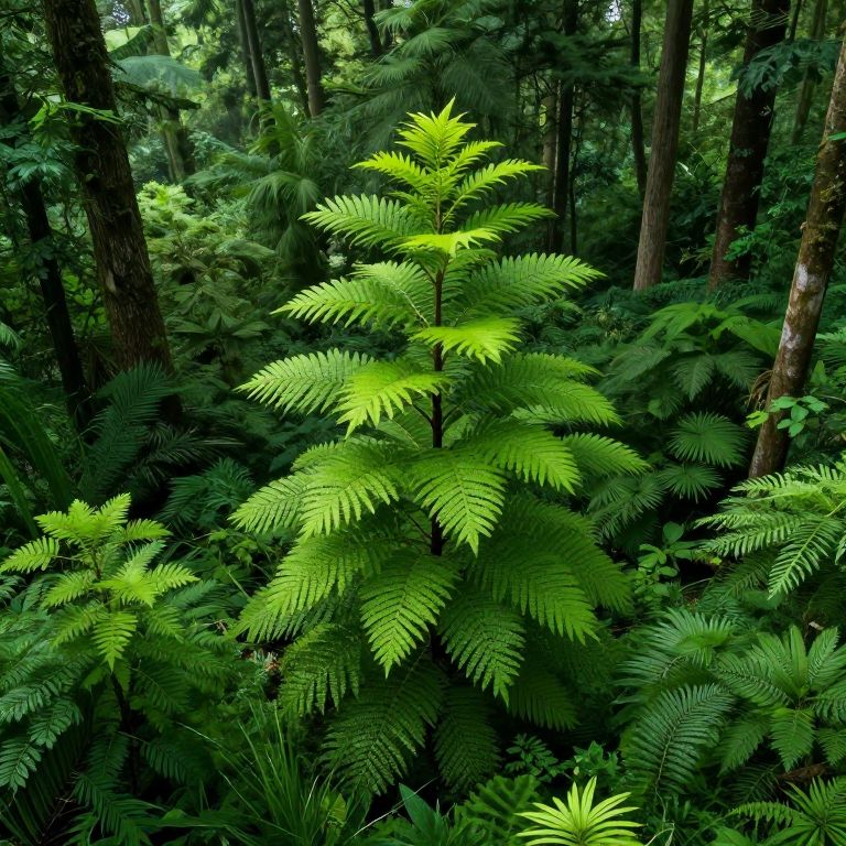 Photograph of a lush forest scene featuring a vibrant, green fern plant with wide, delicate fronds prominently in the center. The fern's bright yellow-green leaves contrast against the darker, shadowed background of dense tree trunks and other foliage. The forest floor is densely covered with various green plants, creating a rich, textured environment. Sunlight filters through the canopy, highlighting the fern's fresh, lively color and intricate leaf patterns. The overall composition emphasizes the natural beauty and diversity of the forest ecosystem.