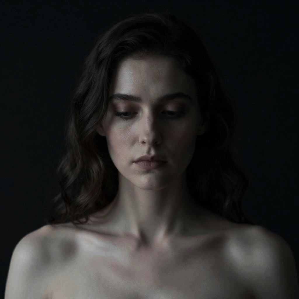 Photograph of a woman with pale skin and wavy dark hair, partially illuminated by a soft light. She has a solemn expression, eyes slightly downcast, and her face is in shadow. Black background. Upper body visible.