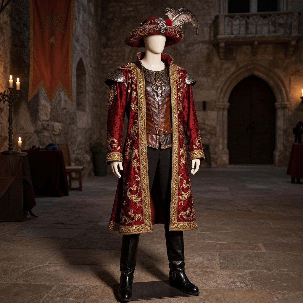 A detailed mannequin standing in a dimly lit medieval courtyard, wearing a richly embroidered red and gold jacket with golden brocade trim, a leather corset, and a wide, ornate hat adorned with feathers. The mannequin's posture is upright and poised, with intricate metal details on the armor-like jacket and a pair of polished black leather boots that gleam under soft candlelight. The background features ancient stone walls, a rustling banner in the wind, and a distant stone archway, evoking a timeless, slightly mysterious atmosphere. The overall style blends fantasy realism with meticulous craftsmanship, capturing both the elegance and grandeur of a medieval festival scene.