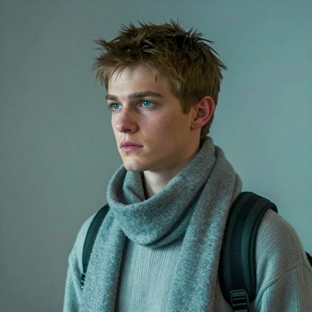 Photograph of a young man with messy, wet, blonde hair, dirt on his face, and a bruise on his right cheek. He wears a green military-style jacket with black straps. His intense gaze is directed at the camera. Blurred background. Upper body visible. One small earring in his left ear. Mouth slightly open.