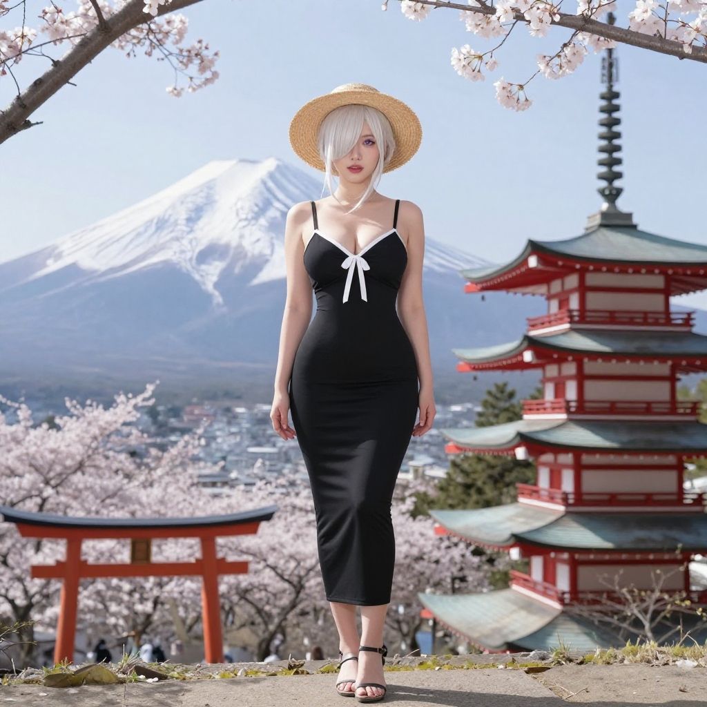 Photorealistic, real life, platinum blonde hair, purple eyes, long hair, single hair bun, blunt bangs, hair over one eye, large breasts (full body, 1girl, solo:1.2), black one-piece dress, spaghetti straps, white ribbon, sandals, straw hat with white flowers cherry blossom grove, mountain, mount Fuji, pagoda, torii gates