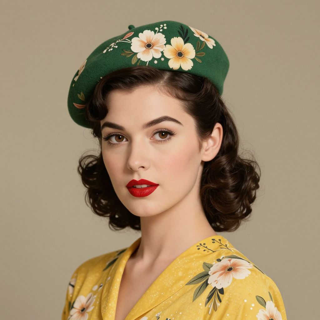 A vintage-inspired digital illustration featuring a woman adorned in a 1940s-style green floral beret tilted at an angle, complemented by bold red lipstick and a yellow dress with floral accents, evoking a retro charm and high-definition detail.