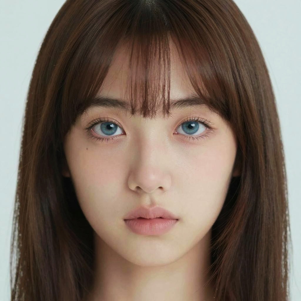 This is a close-up photograph of a young woman with fair skin and light blue eyes. She has straight, shoulder-length brown hair with bangs that slightly cover her forehead. Her face is softly lit, and she is looking directly at the camera with a slight, neutral expression. The background is a plain, light blue, and she is wearing no visible makeup. The image has a slightly soft focus, giving it a gentle, natural look.