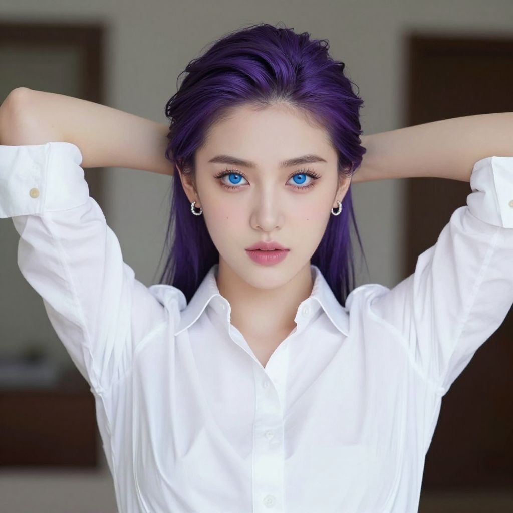 Photorealistic digital portrait of an Asian woman with vibrant purple, sleek, shoulder-length hair. She is wearing a white, button-up shirt with sleeves rolled to the elbows, gold hoop earrings, a delicate gold necklace, and a gold bracelet. Her hands are raised, fingers interlaced behind her head, highlighting her confident, poised expression. She has smooth, fair skin, well-defined eyebrows, and subtle makeup with pink lipstick. The background is softly blurred with warm, ambient lighting and a hint of green foliage. The overall style is modern and polished, with a focus on her elegant appearance.
