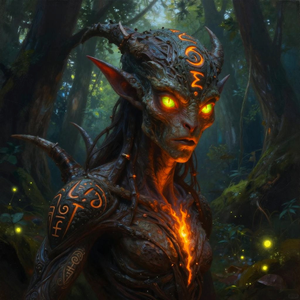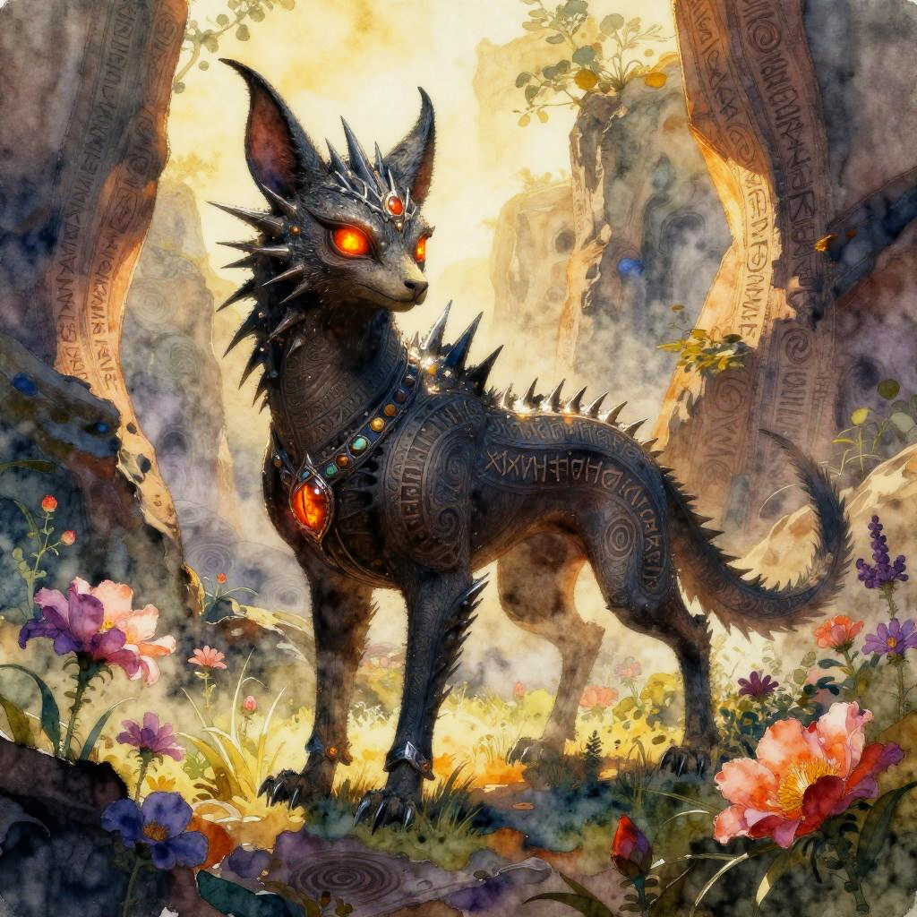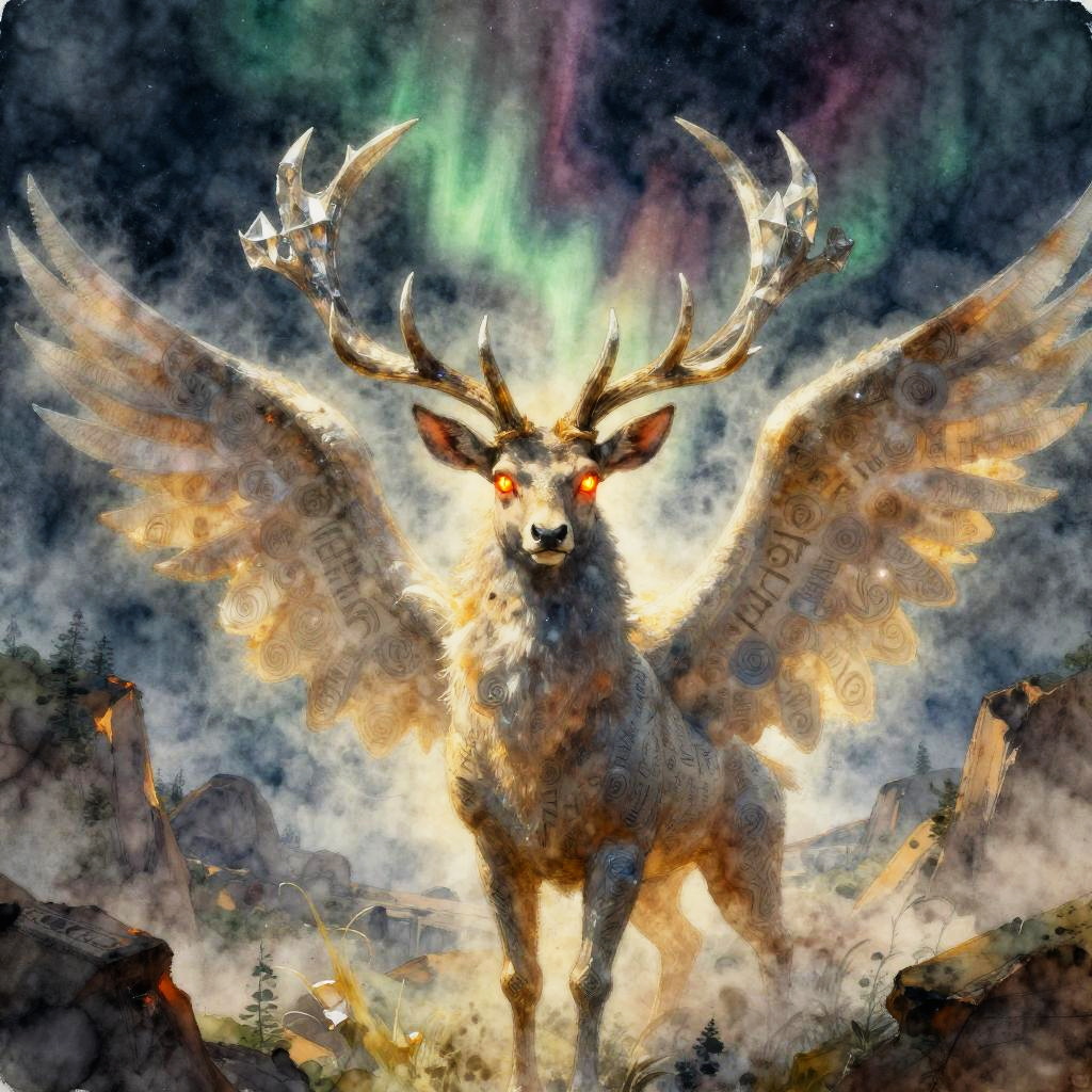 Mythic seraphic stag with crystalline antlers and nebula eyes, pupils razor-slit and glowing fiery orange, ancient runes swirling and carved into surfaces, set within ethereal star-lit valley under cosmic aurorae, surreal fantasy atmosphere, digital painting, watercolor and soft ink wash hybrid, golden-hour rim light, soft volumetric fog, atmospheric perspective, dramatic contrast, subtle bloom, intricate textures, immersive depth, evocative color grading