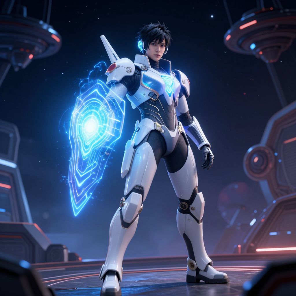 Kobeni CSM cosplay in a vibrant, futuristic mecha combat setting with glowing neon armor, floating energy blades, and a cyberpunk city backdrop under a stormy night sky, detailed facial features and dynamic pose, high-resolution, cinematic lighting, MidJourney style.