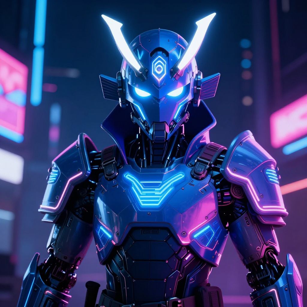 Cyberpunk-style digital artwork of a female warrior with black hair, neon armor, wielding a glowing pink sword in a futuristic cityscape.