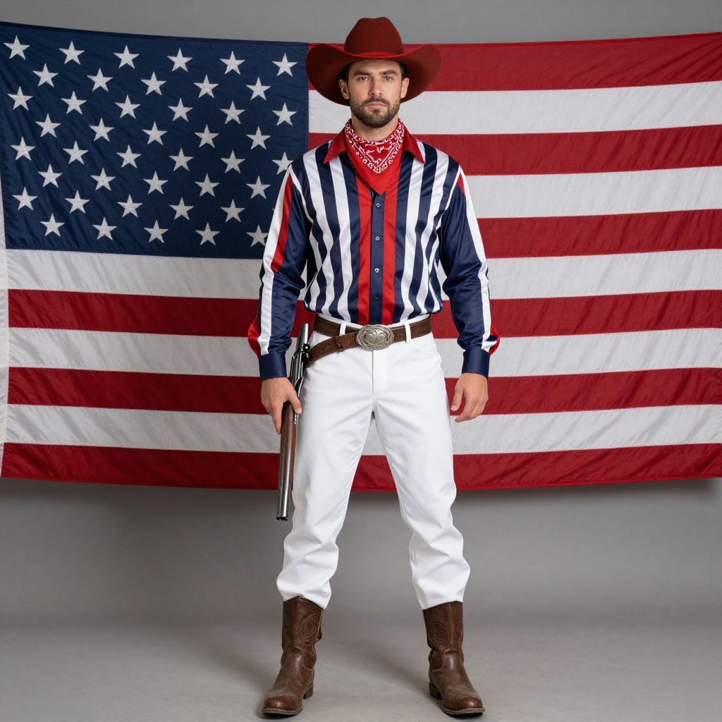 American icons costume, 1boy, male focus, solo, cowboy hat, hat, shirt, standing, facial hair, full body, boots, beard, pants, belt, cowboy western, brown footwear, american flag, long sleeves, gun, weapon, white pants, bandana