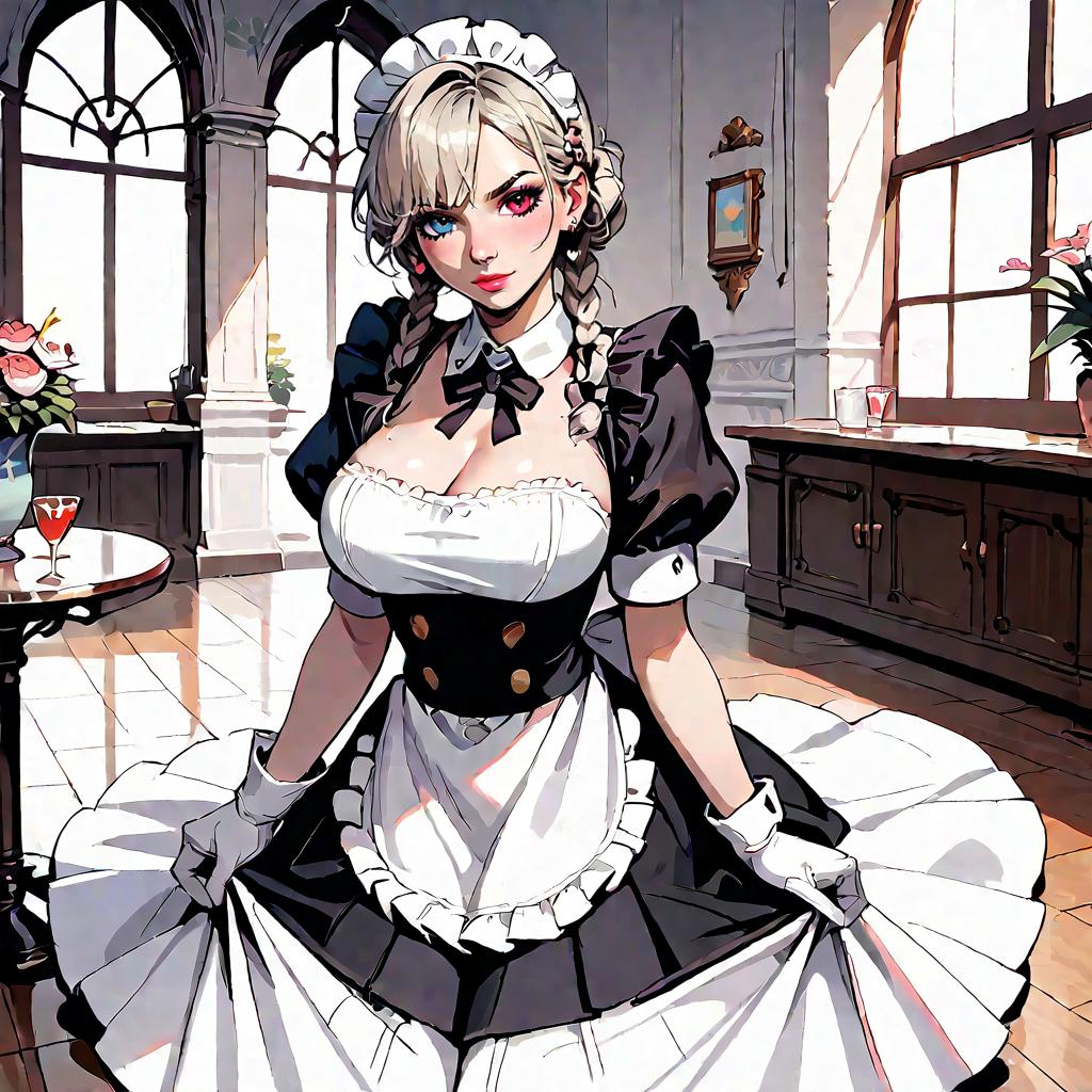 Score_9, score_8_up, score_7_up, multiple girls, 2girls, gloves, yuri, breasts, underwear, panties, thighhighs, elbow gloves, clothes lift, maid, large breasts, white panties, maid headdress, flower, brown hair, short hair, blonde hair, twin tails, white gloves, lingerie, blush, window, skirt lift, panty pull, garter belt, hair flower, apron, brown eyes, looking at viewer, frills, purple eyes, dress lift, open clothes, dress, blue eyes, hair ornament, breasts out, curtains, open shirt, black hair, ribbon, shirt, from side