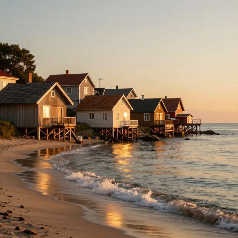 Photograph of a serene beach at sunset featuring a row of charming, wooden beach huts with sloping roofs, elevated on stilts, reflecting golden sunlight. The huts are aligned along the shore, with gentle waves lapping at the sandy beach in the foreground. The sky transitions from soft orange to pale blue, enhancing the warm, peaceful atmosphere. A small tree is visible to the left of the huts, adding greenery to the scene. The huts' windows glow warmly, contrasting with the cool tones of the water and sky.
